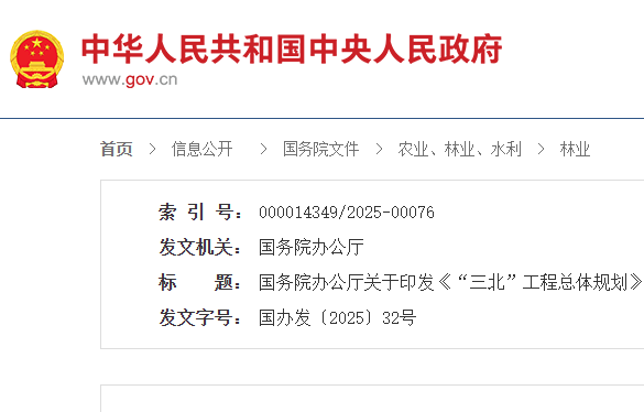 国务院办公厅关于印发《“三北”工程总体规划》的通知国办发〔2025〕32号各省、自治区、直辖市人民政府,新疆生产建设兵团,国务院各部委、各直属机构:修编后的《“三北”工程总体规划》已经国务院同意,现印发...