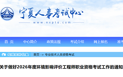 宁夏2026年度环境影响评价工程师职业资格考试工作通知各地级市人力资源社会保障局,区直有关部门,各有关单位: 根据《人力资源和社会保障部人事考试中心 关于做好2026年度环境影响评价工程师职业...