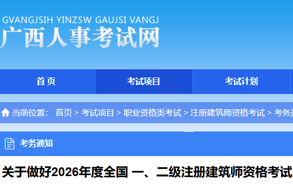 广西考区2026年一、二级注册建筑师资格考试考务工作通知根据《人力资源和社会保障部人事考试中心 住房和城乡建设部执业资格注册中心关于2026年度全国一、二级注册建筑师资格考试考务工作的通知》(人...