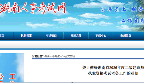 湖南省2026年度二级建造师执业资格考试考务工作的通知根据住房和城乡建设部执业资格注册中心《关于提供2026年度二级建造师执业资格考试有关服务的说明》内容,现就我省2026年度二级建造师执业资格...