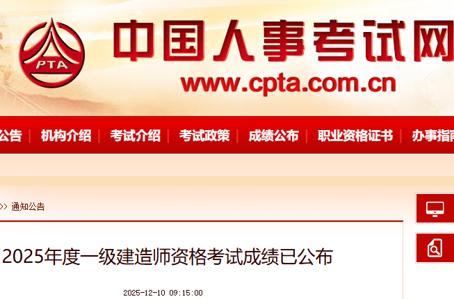2025年度一级建造师资格考试成绩已公布,成绩查询通知 2025年度一级建造师资格考试成绩于2025年12月10日公布。请考生到中国人事考试网网站“成绩查询”栏目进行查询。 查询网址:中国人事考试网...