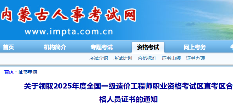 内蒙古2025年一级造价工程师考试区直考区合格人员证书领取通知