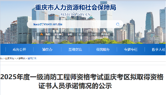 重庆考区2025年度一级消防工程师资格考试拟取得资格证书人员承诺情况的公示2025年度一级注册消防工程师资格考试成绩已于2026年1月20日上线供考生查询。根据《国务院办公厅关于全面推行证明事项和...