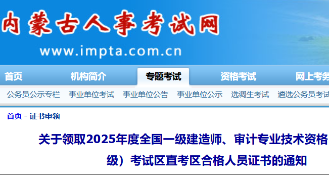 内蒙古2025年全国一级建造师考试区直考区合格人员证书领取通知关于领取2025年度全国一级建造师、审计专业技术资格(初、中级)考试区直考区合格人员证书的通知区直考区各位考生: 2025年度全...