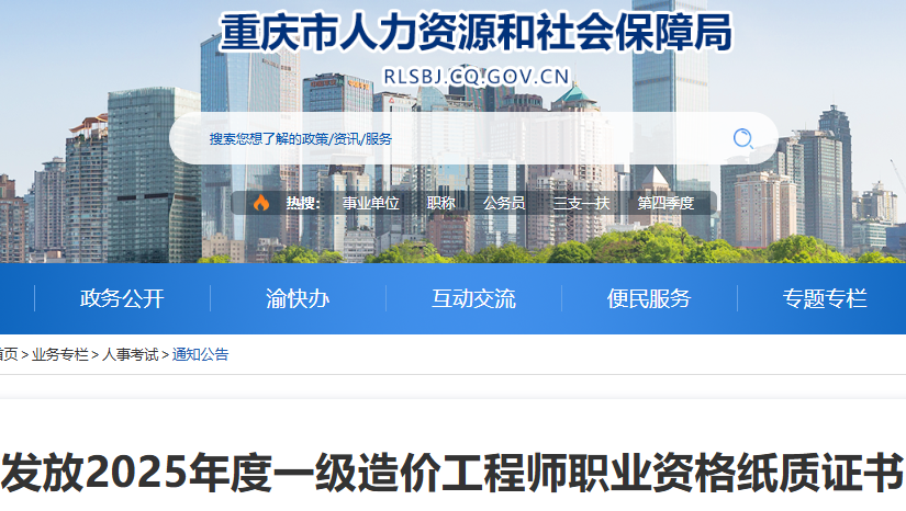 重庆2025年一级造价工程师职业资格纸质证书发放通告