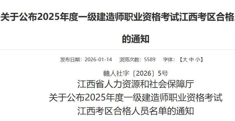 江西省2025年度一级建造师职业资格考试合格人员名单公布通知赣人社字〔2026〕5号江西省人力资源和社会保障厅关于公布2025年度一级建造师职业资格考试江西考区合格人员名单的通知各设区市人力资源...