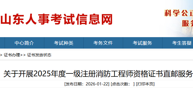 山东省2025年度一级注册消防工程师资格证书直邮服务通知各位考生:2025年度一级注册消防工程师资格考试山东省成绩合格人员即日起可办理证书直邮,证书直邮即证书印制单位将证书通过中国邮政“EMS特...