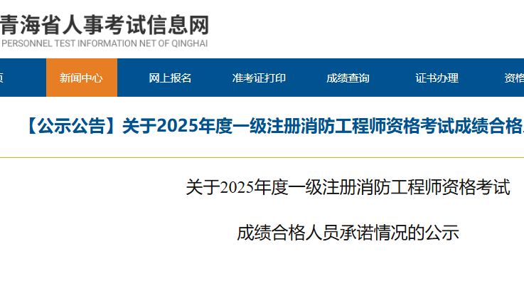 青海省2025年度一级注册消防工程师资格考试成绩合格人员承诺情况公示根据《国务院办公厅关于全面推行证明事项和涉企经营许可事项告知承诺制的指导意见》(国办发〔2020〕42号)和《人力资源社会保障部...