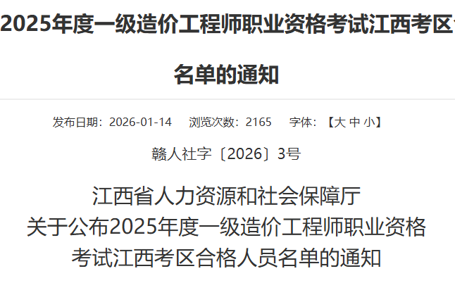 江西省2025年度一级造价工程师职业资格考试合格人员名单公布通知赣人社字〔2026〕3号江西省人力资源和社会保障厅关于公布2025年度一级造价工程师职业资格考试江西考区合格人员名单的通知各设区市...