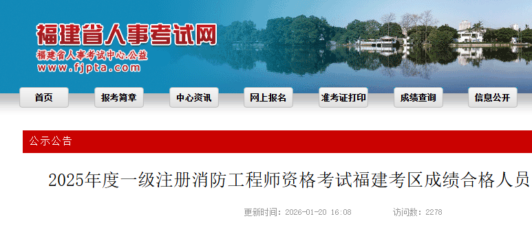 福建省2025年一级消防工程师资格考试成绩查询通知 福建省2025年度一级注册消防工程师资格考试成绩于2026年1月20日公布。请考生到中国人事考试网网站“成绩查询”栏目进行查询。 查询网址:中国...