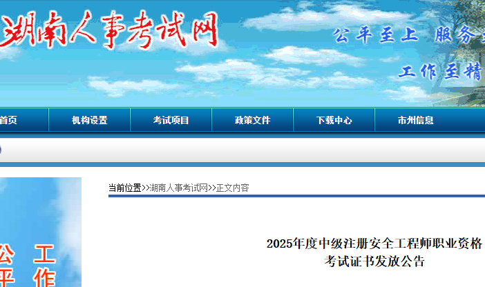 湖南省2025年中级安全工程师职业资格考试证书发放公告
