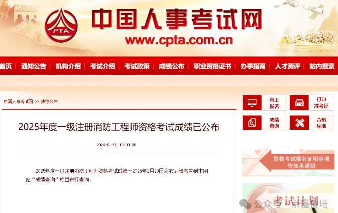 中国人事考试网发布了《2025年度一级注册消防工程师资格考试成绩已公布》的通知,参加2025年度一级注册消防工程师资格考试的考生可于2026年1月20日起登录中国人事考试网“成绩查询”栏目进行成绩...