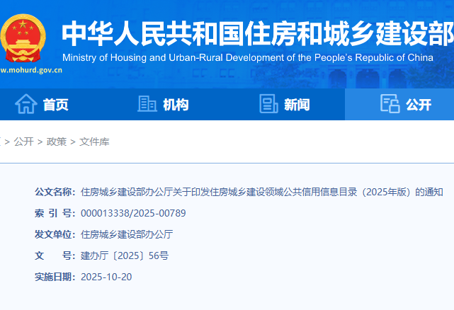 住建部:印发住房城乡建设领域公共信用信息目录(2025年版)的通知