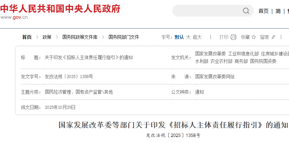 国家发展改革委等部门关于印发《招标人主体责任履行指引》的通知发改法规〔2025〕1358号各省、自治区、直辖市、新疆生产建设兵团发展改革委、工业和信息化主管部门、住房城乡建设厅(委、局)、交通运输厅(局...