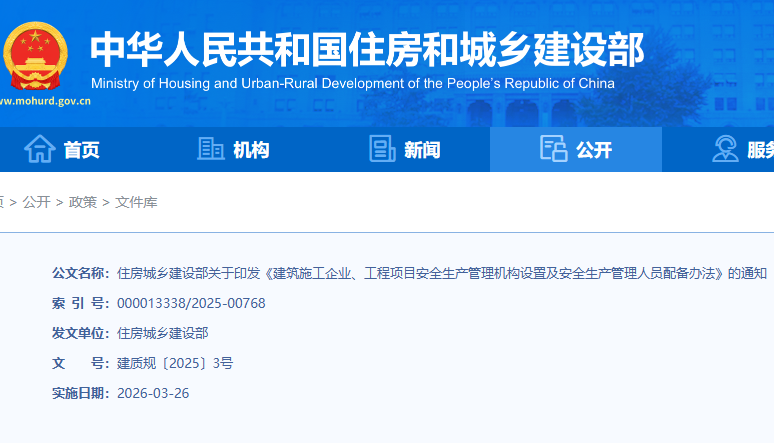 住建部:印发《建筑施工企业、工程项目安全生产管理机构设置及安全生产管理人员配备办法》