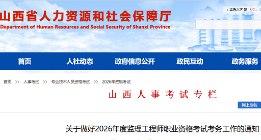 山西省2026年度监理工程师职业资格考试考务工作的通知各有关单位:根据《人力资源和社会保障部人事考试中心 关于2026年度监理工程师职业资格考试考务工作的通知》(人考中心函〔2026〕3号)要求,现将我...