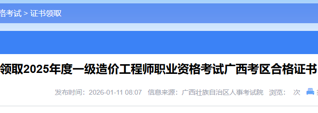 广西考区2025年度一级造价工程师职业资格考试合格证书(合格证明)领取通知各位考生:2025年度一级造价工程师职业资格考试广西考区合格证书(合格证明)已开始发放,现将领取有关事项通知如下:一、寄递...