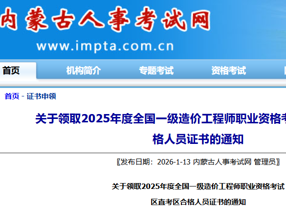 内蒙古区直考区2025年一级造价工程师考试合格人员证书领取通知