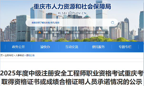 重庆2025年中级安全工程师考试拟取得资格证书或成绩合格证明人员公示
