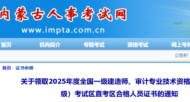 内蒙古区直考区2025年一级建造师考试合格人员证书领取通知