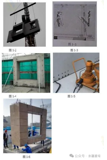 【问题】1.分别写出预制剪力墙板施工记录图 1-2~图 1-6 代表的施工工序。(如图 1-2 墙板起吊)写出五张图片的施工顺序。(如 2-3-4-5-6)