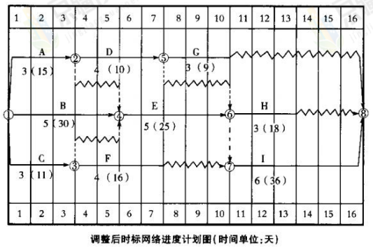 使工作 H,I 的开始作业时间均相应推迟 2 天;由于施工机械故障,致使工作 G 作业时间延