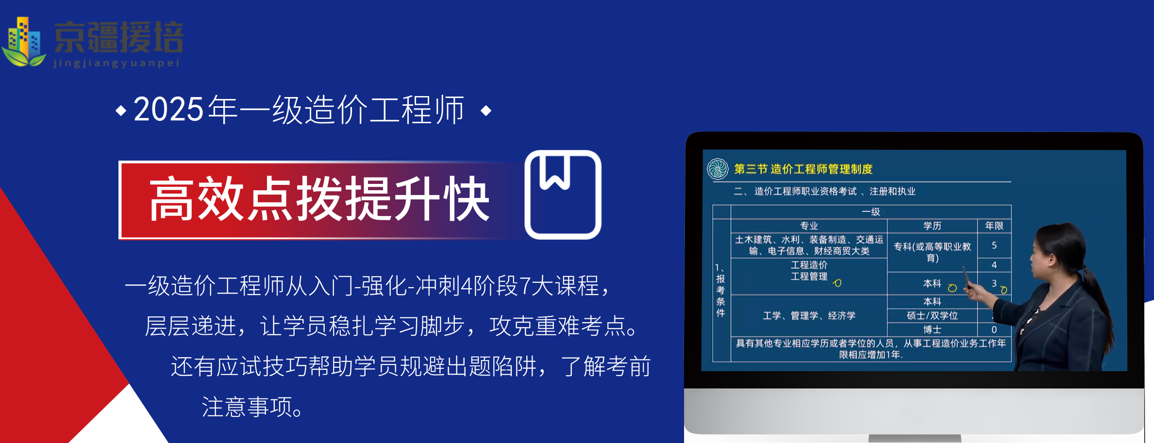 京疆援培网校2025年度一级造价工程师考试辅导单科突破班网络课程,携手资深专家名师团队,针对不同学习阶段设计不同的课程模块,帮助考生掌握考试要点难点,强化备考和应试技巧训练,协助考生掌握出题规律和解题思路,突破专业实务考试重点,帮助考生顺利通过考试。